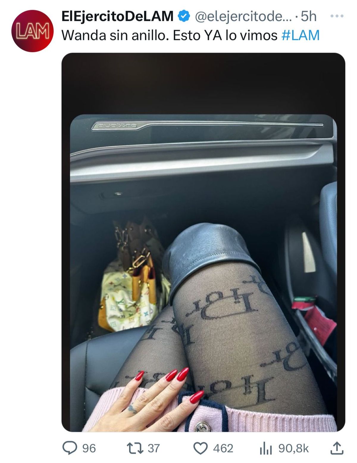 “Wanda sin anillo. Esto YA lo vimos", escribió la cuenta @ejercitodelam ya que no seria la primera vez que la conductora se muestra sin la sortija como señal de separación.