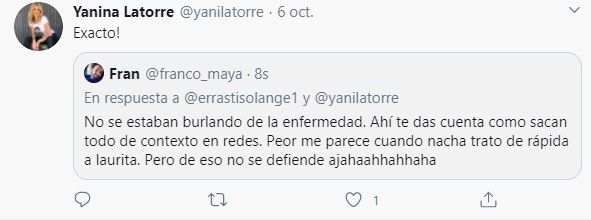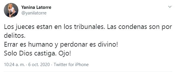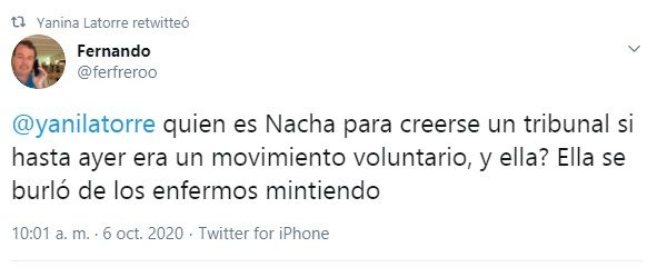 "@yanilatorre quién es Nacha para creerse un tribunal si hasta ayer era un movimiento voluntario, ¿Y ella? Ella se burló de los enfermos mintiendo", sostuvo un usuario en su tuit. Y Yanina Latorre arrojó: "Los jueces están en los tribunales. Las condenas son por delitos. ¡Errar es humano y perdonar es divino! Solo Dios castiga. ¡Ojo!".