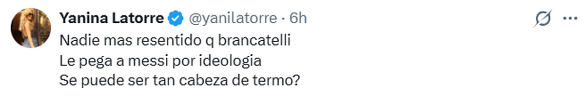 Yanina Latorre le dedicó un duro posteo en X al periodista Diego Brancatelli por un tremendo comentario sobre Lionel Messi.