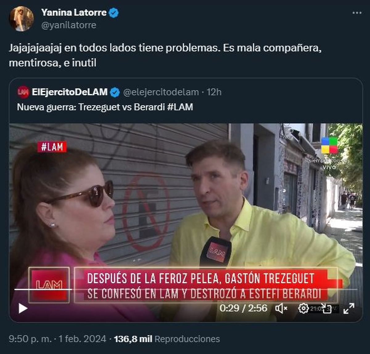 Pero eso no fue todo, porque más adelante, en una publicación, Latorre señaló un comentario de su colega Marcela Feudale y lanzó: "Qué de cuarta ella... que de décima todo. ¿Quién es? Ahhh pará, según Feudale es una diva".
