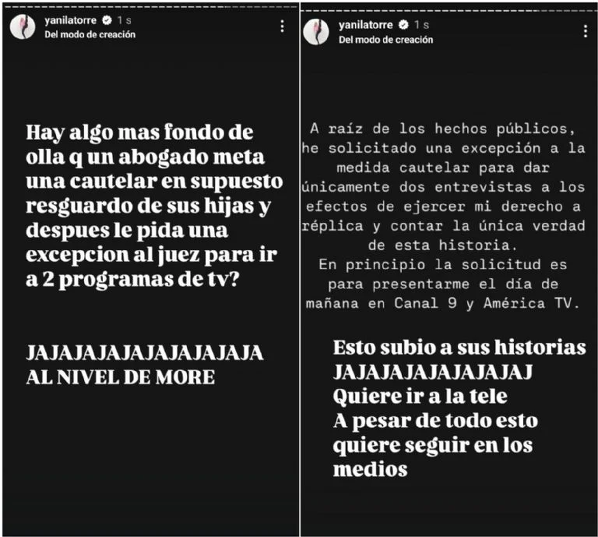 Yanina explicó a sus seguidores que por este motivo no pudieron tocar el tema en Sálvese quien pueda ni en LAM y añadió: “¿Hay algo más fondo de olla que un abogado meta una cautelar en supuesto resguardo de sus hijas y después le pida una excepción al juez para ir a dos programas de TV? Jajaja, al nivel de More”.