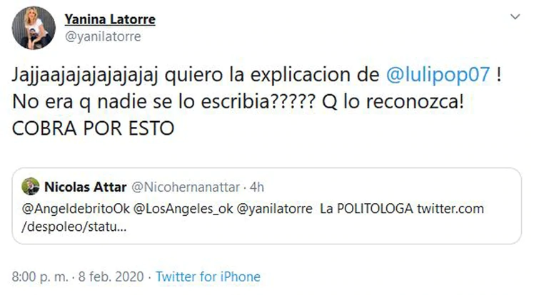 Más tarde apareció un posteo del periodista Antonio Llorente que publicó exactamente lo mismo que Luli. Al notarlo, Yanina Latorre publicó un mensaje, con una fuerte declaración: “¡Quiero la explicación de @lulipop07! ¿No era que nadie se lo escribía? ¡Que lo reconozca! Cobra por esto”.