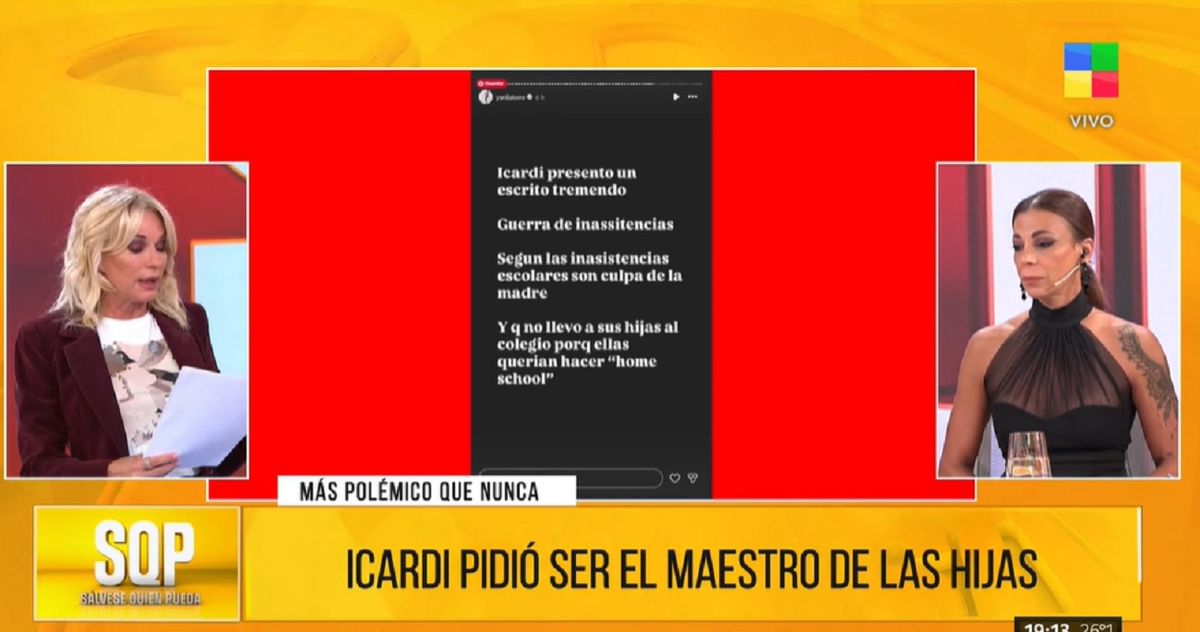 "Icardi presentó un escrito que a partir de hoy él va a hacer home school los día miércoles, jueves y viernes con las hijas. Él les va a enseñar y ser el maestro porque dice que las chicas prefieren estudiar con él en la casa, un delirio. Él está empecinado en no mandarlas", concluyó la conductora.