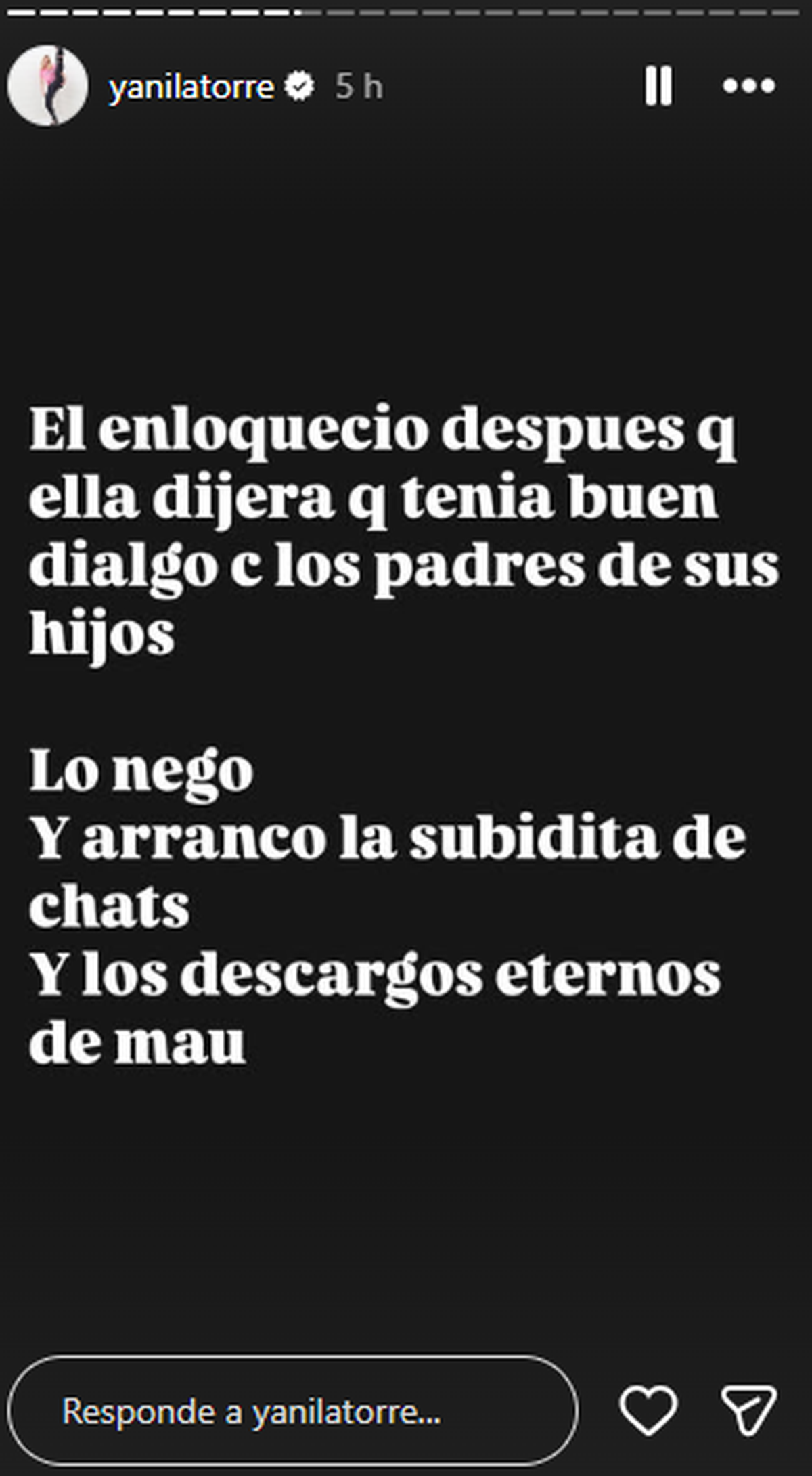 Ante esto, Yanina también dijo lo suyo: “Él enloqueció después de que ella dijera que tenía buen diálogo con los padres de sus hijos. Lo negó, arrancó la subidita de chats y los descargos eternos de Mau”.