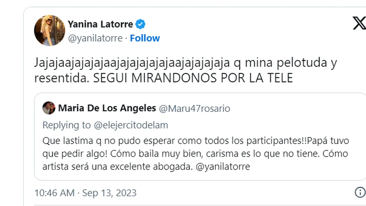 Después de la performance de Lola en el Bailando, Yanina Latorre recibió un comentario fuerte de parte de una seguidora. "¡Qué lástima que no pudo esperar como todos los participantes! ¡Papá tuvo que pedir algo! Como baila muy bien, carisma es lo que no tiene. Como artista será una excelente abogada", le dijeron a la angelita.
