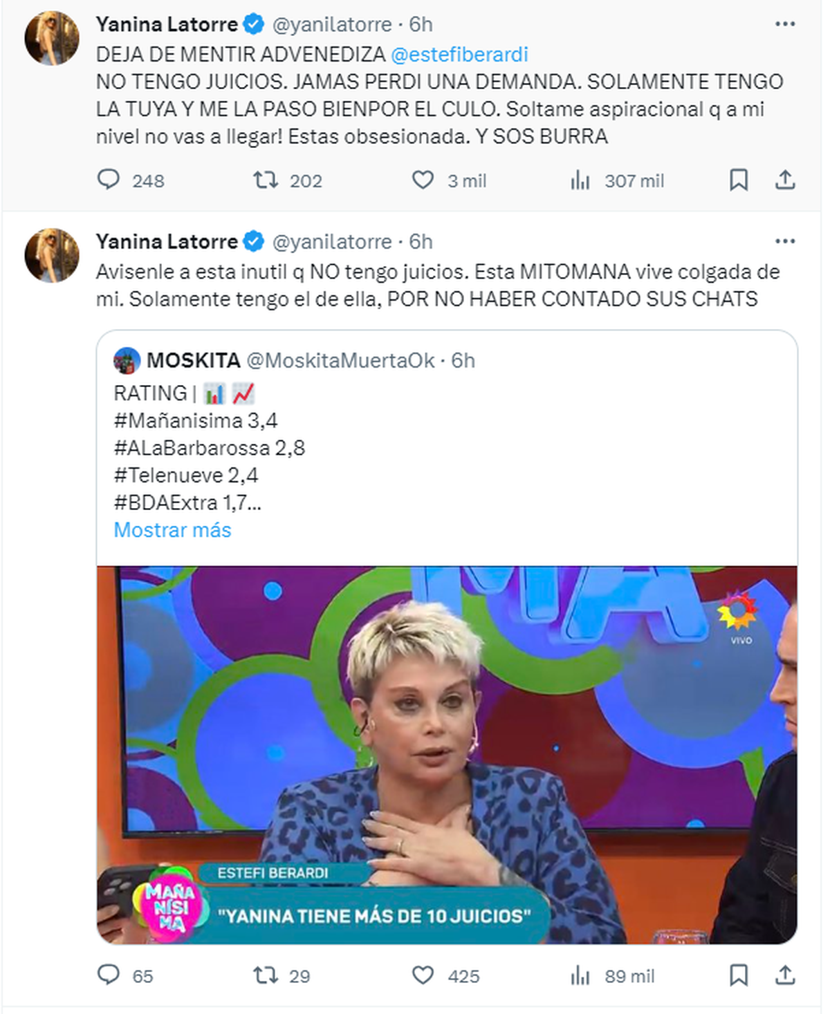 En un segundo tuit, Yanina redobló su apuesta contra Estefi. "Dejá de mentir advenediza. No tengo juicios. Jamás perdí una demanda. Solamente tengo la tuya y me la paso bien por el cul... ¡Soltame aspiracional, que a mi nivel no vas a llegar! Estás obsesionada y sos una burra”, remató.