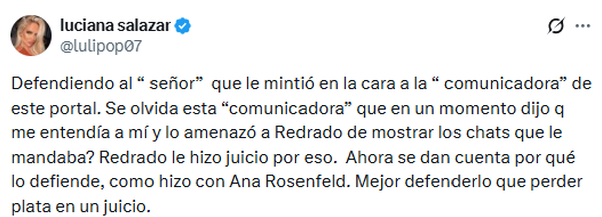 Frente a esto, la modelo reaccionó fuertemente: "Defendiendo al ‘señor’ que le mintió en la cara a la ‘comunicadora’ de este portal. ¿Se olvida esta ‘comunicadora’ que en un momento dijo que me entendía a mí y amenazó a Redrado de mostrar los chats que le mandaba? Redrado le hizo juicio por eso. Ahora se dan cuenta por qué lo defiende, como hizo con Ana Rosenfeld, mejor defenderlo que perder plata en un juicio".