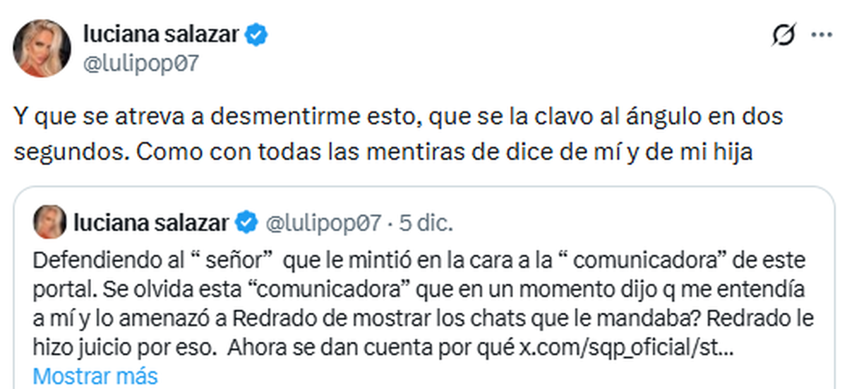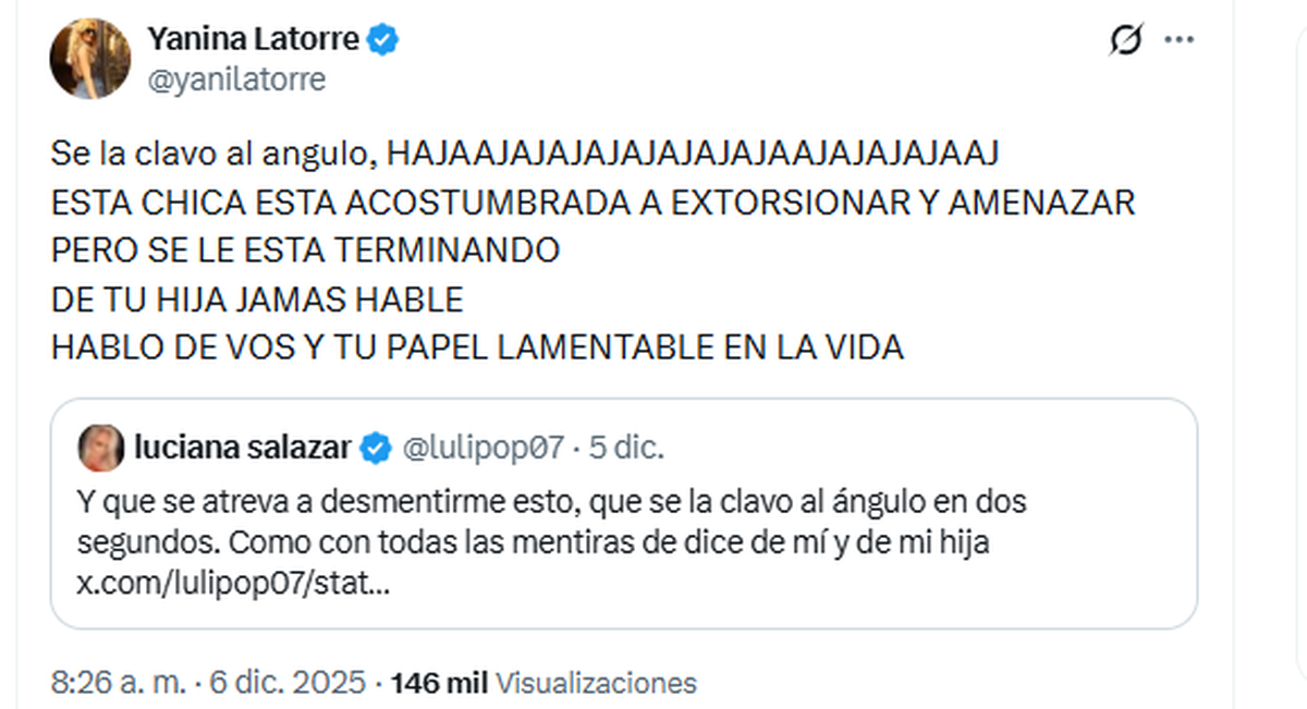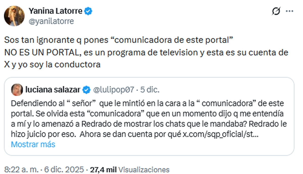 Luciana Salazar y Yanina Latorre sumaron un nuevo capítulo a su enfrentamiento, un conflicto que viene escalando desde hace meses. Esta vez, el cruce se dio en X luego de que la conductora de SQP (América TV) respondiera a un comentario de Salazar, quien volvió a apuntar contra su ex, Martín Redrado, por el festejo de cumpleaños que organizaría mientras —según ella— debe “cuatro años de cuota alimentaria”.