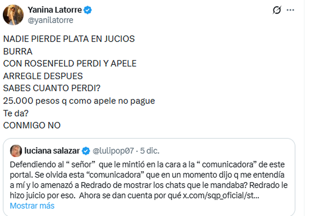Horas más tarde, Yanina Latorre, como era de esperar, no se quedó de brazos cruzados y salió a responder cada uno de los mensajes publicados en X.