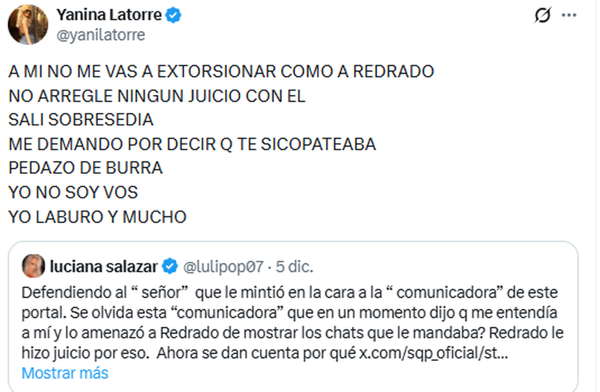 Yanina Latorre y Luciana Salazar se cruzaron fuerte en X a raíz de un comentario que la modelo hizo sobre Martín Redrado. Terrible ida y vuelta.