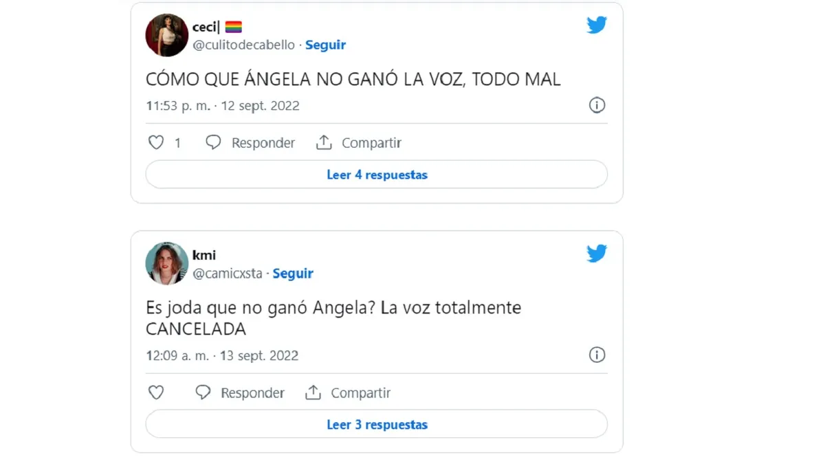 "La ganadora de la Voz Argentina es y será Angela", "¿Cómo que no gano Ángela? Con La Voz anterior hicieron lo mismo", "¡Indignada! ¡Ángela es la ganadora! No veo más La Voz, estoy re enojada", "¡Nos robaron Ángela, pero vos ya ganaste!", "¿Cómo que Ángela no gano? ¡Todo mal!", "¿Es joda que no ganó Ángela? La Voz, totalmente cancelada", fueron algunos de los mensajes que se replicaron en dicha red social.