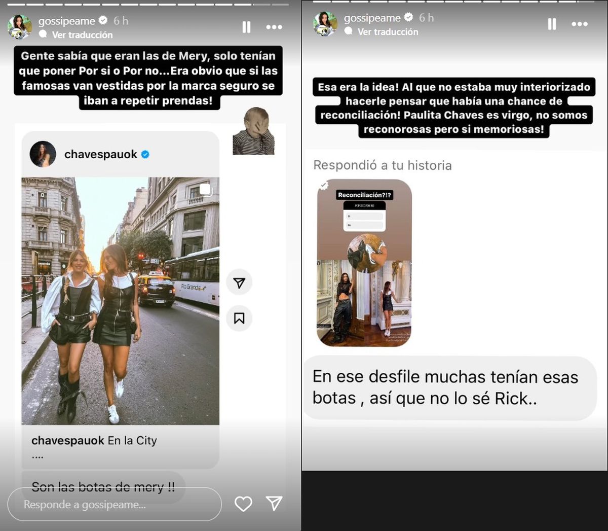 “Era un posteo que subió, no sé si Pau o Mery, que eran ellas dos. No se si las zapatillas de Pau y las botas de Mery pero bueno, habíamos ido al mismo desfile y las botas eran muy parecidas a las mías. Creo que fue Juariu que hizo como una conexión pero no era yo”, aclaró.