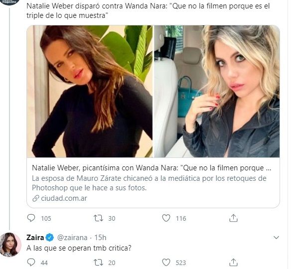 Al enterarse de la repercusión de estas declaraciones, Zaira Nara salió a bancar a su hermana y contestó a una noticia sobre este tema publicada por el portal Ciudad en Twitter: "A las que se operan también critica?", lanzó la conductora.
