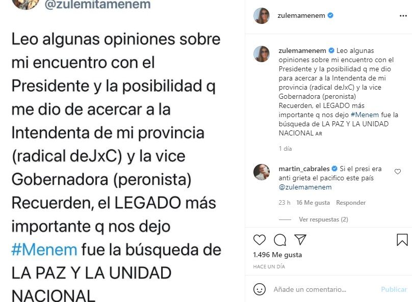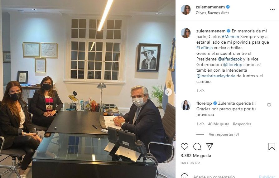 Zulemita Menem mantuvo una serie de reuniones esta semana con importantes funcionarios, entre los que se encontró el presidente, Alberto Fernández. Las fotos las compartió ella misma en Instagram y generó diversas reacciones de sus seguidores.