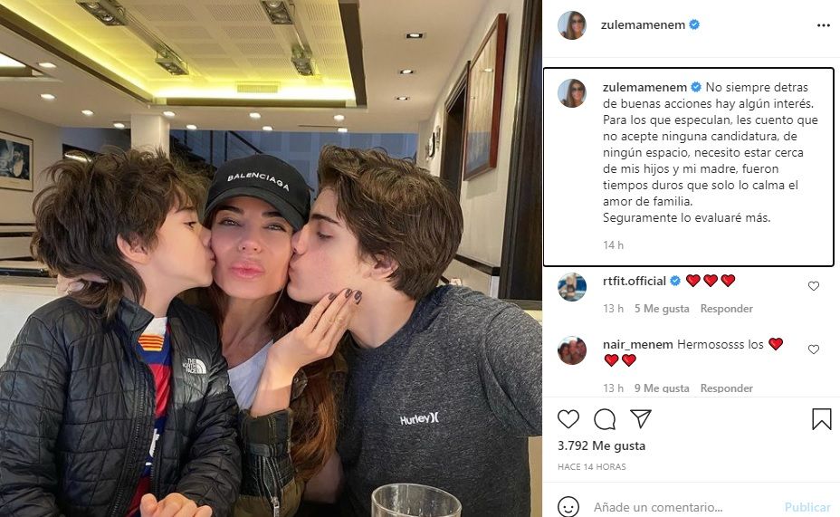 Y dejó en claro que -por el momento- no se meterá de lleno en política con una imagen junto a sus hijos, Luca y Malek: "No siempre detrás de buenas acciones hay algún interés. Para los que especulan, les cuento que no acepté ninguna candidatura, de ningún espacio, necesito estar cerca de mis hijos y mi madre, fueron tiempos duros que solo lo calma el amor de familia. Seguramente lo evaluaré más".
