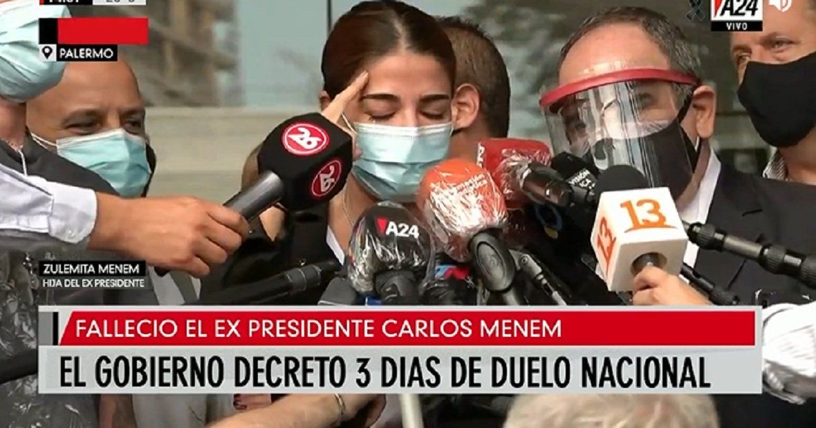 Zulemita Menem habló desde la puerta del sanatorio Los Arcos a horas de la muerte de su padre, Carlos Menem, a los 90 años. El ex presidente será velado en el salón azul del Senado de la Nación.