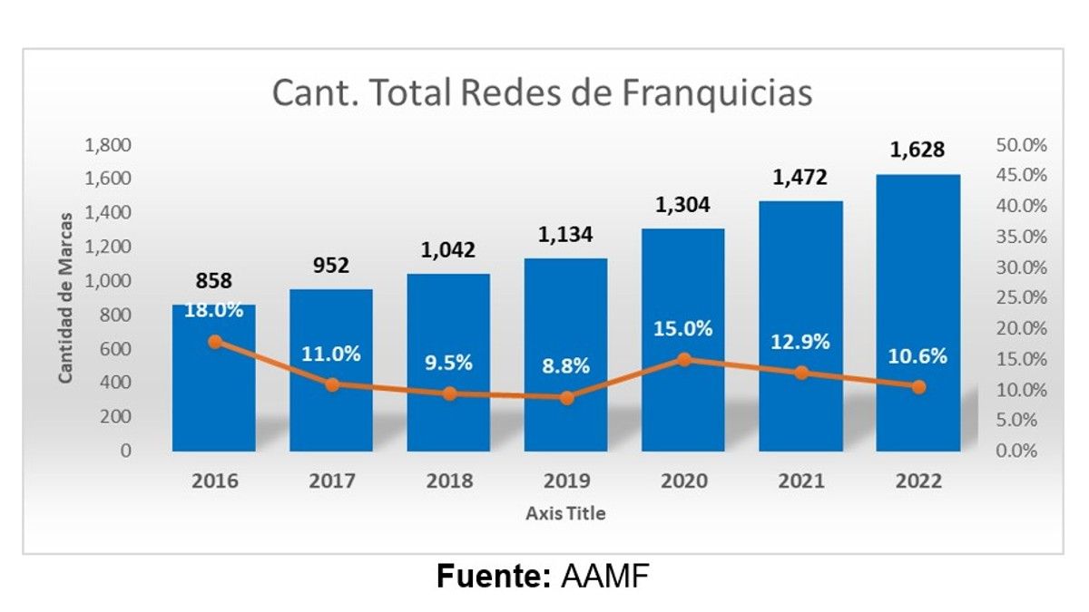 De acuerdo a un relevamiento elaborado por la Asociación Argentina de Marcas y Franquicias (AAMF) sobre la evolución del formato de franquicias en Argentina, hay un total de 163 nuevas marcas durante 2022 (muy similar a las 168 de 2021), lo que implica un crecimiento del 10.6% en la cantidad total de marcas que operan con este sistema en el país.