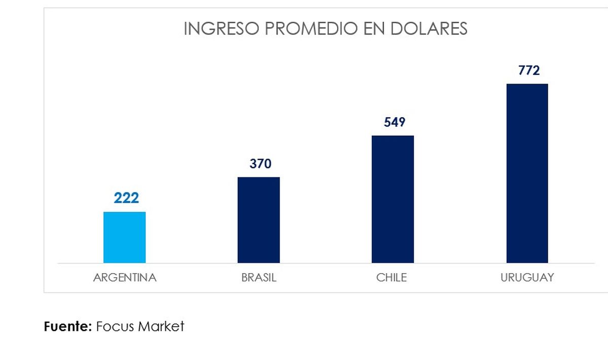 Al considerar al decil más alto, la base promedio de ingreso en Argentina es de USD 532 mensual. Para el caso de Chile USD 1199, Uruguay USD 2178 y Brasil USD 3849. Es decir, que a pesar de aumentos nominales en pesos, nuestro país se mantiene por debajo de los valores en dólares de los países en Latinoamérica (se utilizó la metodología dada por cada instituto nacional de estadística de cada país en dólares oficiales).