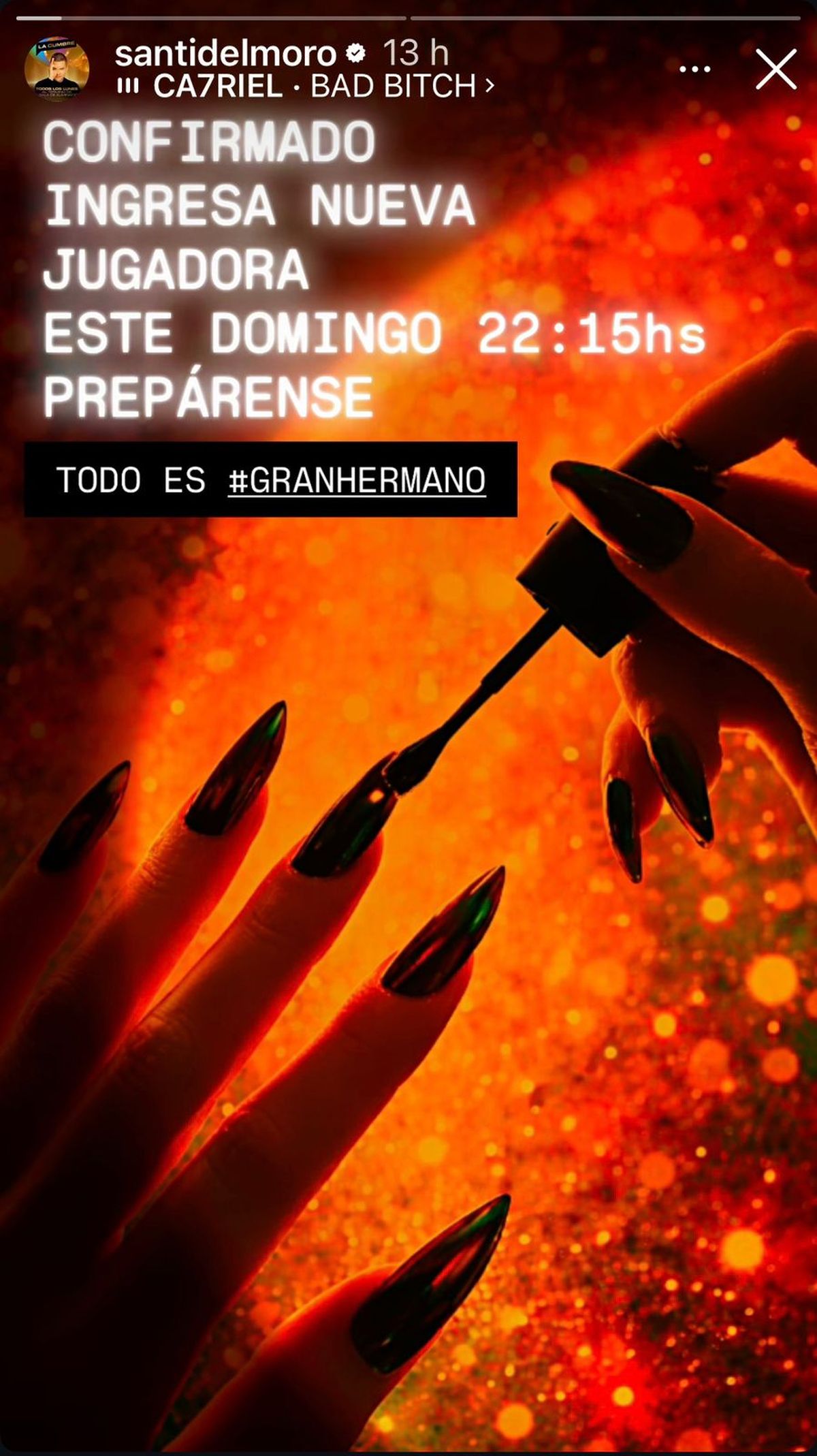 A través de sus Instagram Stories, el conductor compartió una imagen de unas manos femeninas pintándose las uñas y anunció: “Confirmado, inreso nueva jugadora este domingo 22:15 hs. Prepárense. Todo es #GranHermano”.