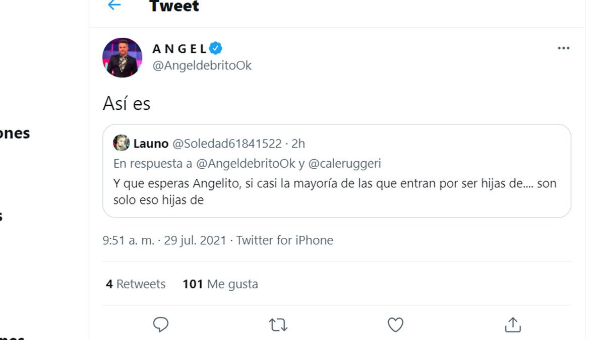 En las redes también la criticaron mucho y Ángel de Brito se hizo eco de esos cuestionamientos: “Y qué esperas Angelito, si casi la mayoría de las que entran por ser hijas de.... son solo eso hijas de”, comentó una seguidora.