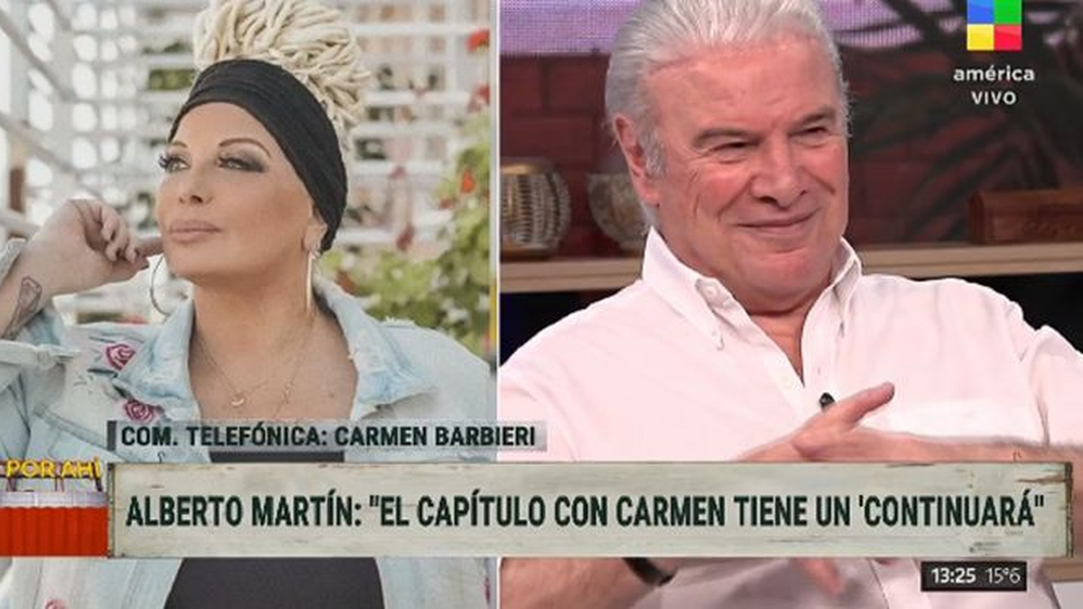 Carmen Barbieri apuró al aire el lunes a Alberto Martín luego de que el actor le declarara su amor: "Es una mujer muy querible, tierna y que me gustó abrazarla. Más no puedo decir", indicó visiblemente emocionado el artista en su visita a "Es por ahí", América.