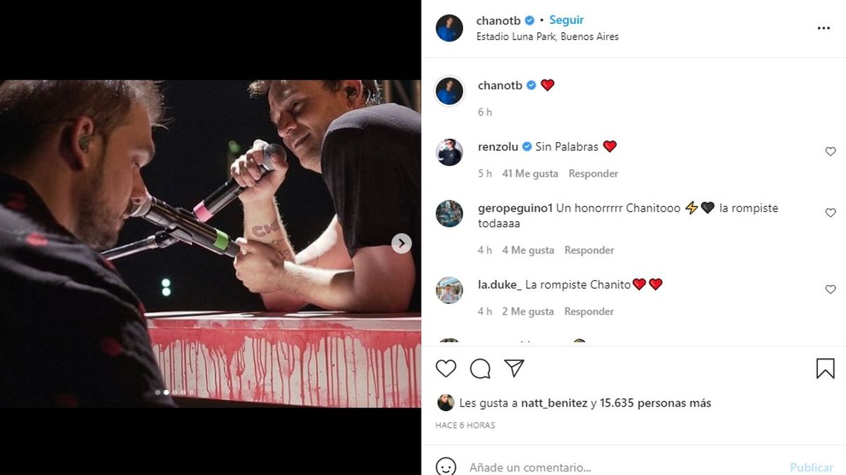 "Gracias x tenerme tan adentro su corazón. Voy a seguir aprendiendo de ustedes. Voy a seguir dejando el alma", expresó el vocalista. Por su parte, en Instagram compartió algunas postales del show y un corazón.