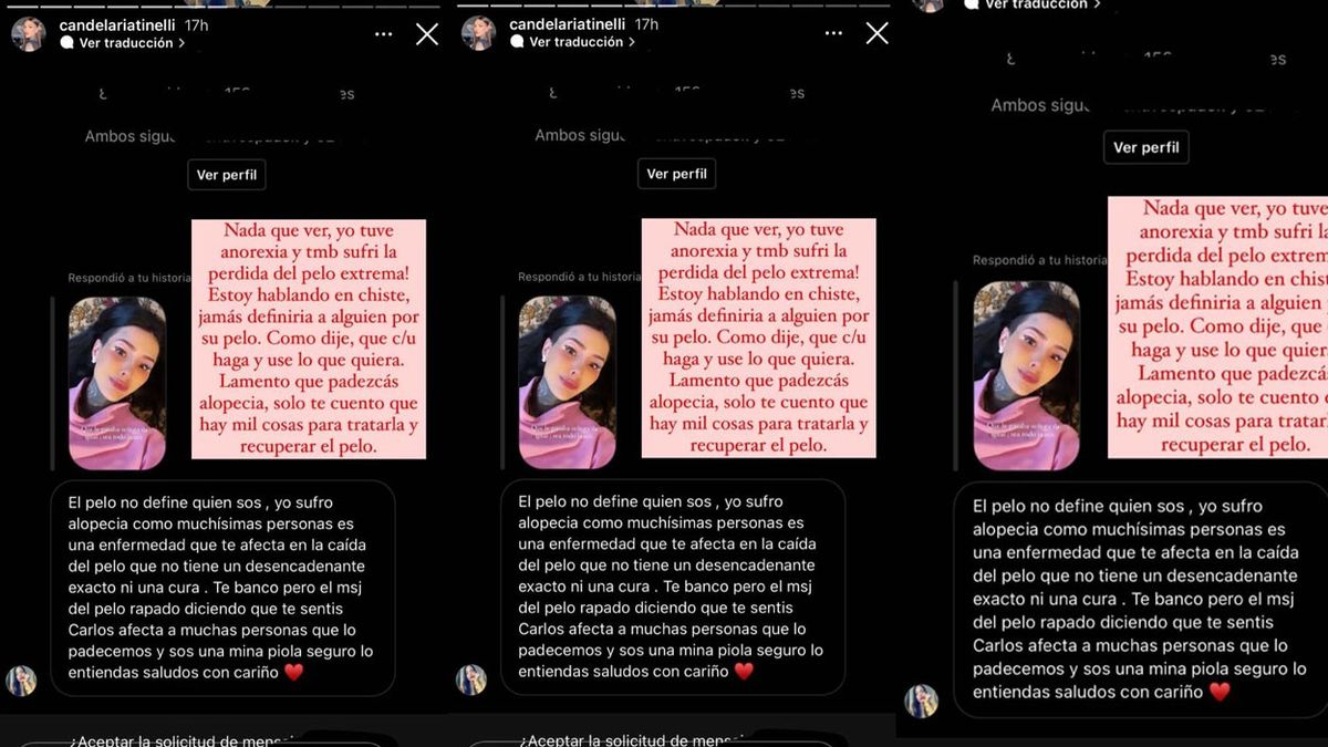 "Como dije, que cada uno haga y use lo que quiera. Lamento que padezcas alopecía, solo te cuento que hay mil cosas para tratarla y recuperar el pelo", cerró la joven de 30 años.