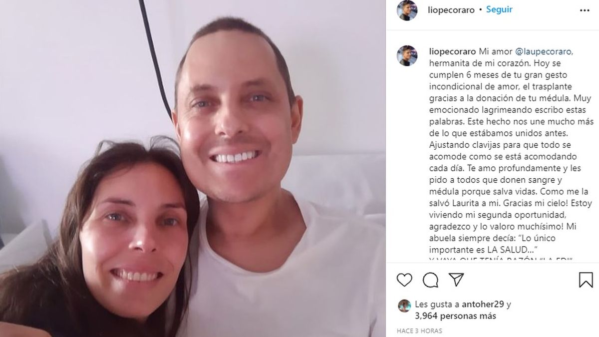 "Mi amor @laupecoraro, hermanita de mi corazón. Hoy se cumplen 6 meses de tu gran gesto incondicional de amor, el trasplante gracias a la donación de tu médula", comenzó movilizado Lío.