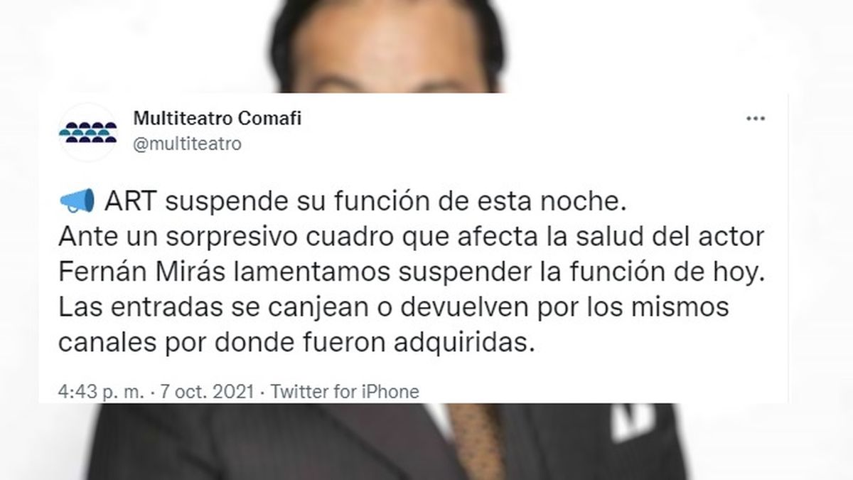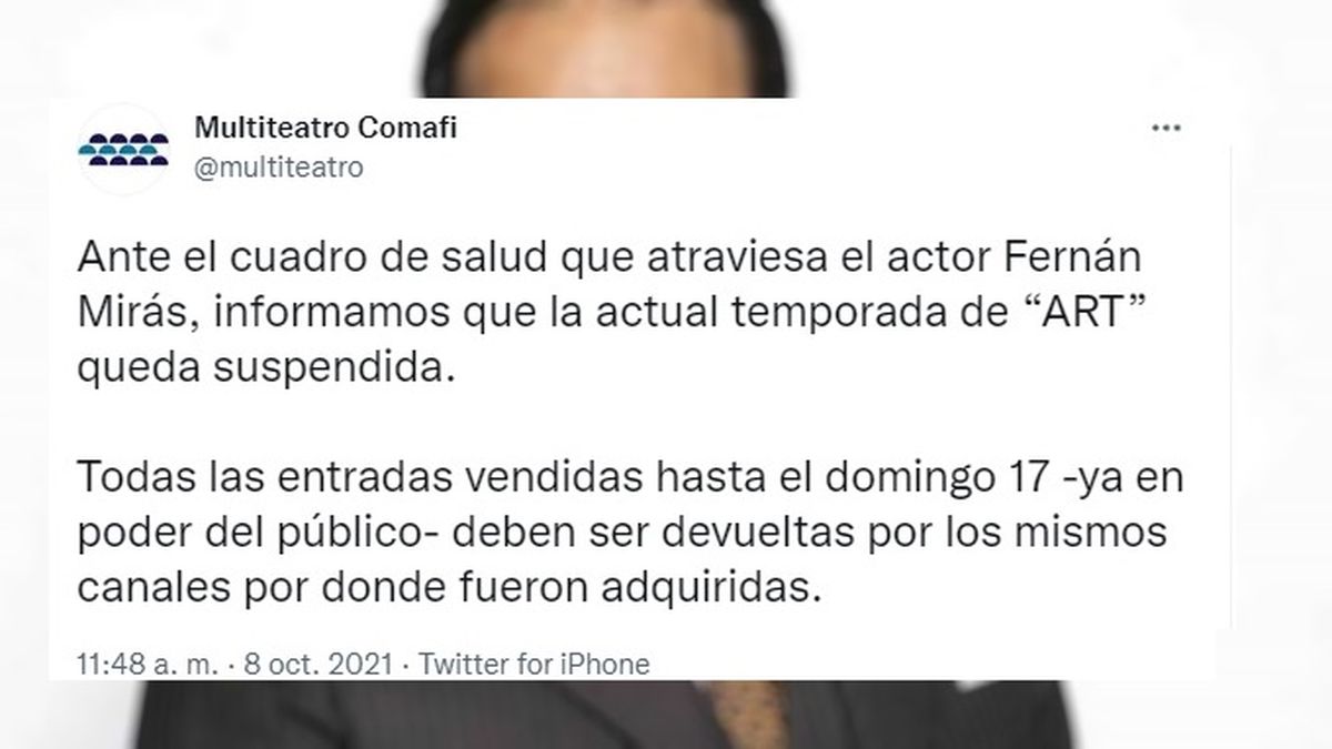 Ayer por la tarde Carlos Rottemberg había anunciado desde su cuenta de Twitter la suspensión de Art, la obra teatral en la que trabaja Fernán Mirás junto a Pablo Echarri y Mike Amigorena , sin explicar demasiado. Esta mañana se confirmó que el actor sufrió un aneurisma que fue agarrado a tiempo, por lo que ya lo operaron y le colocaron un stent.