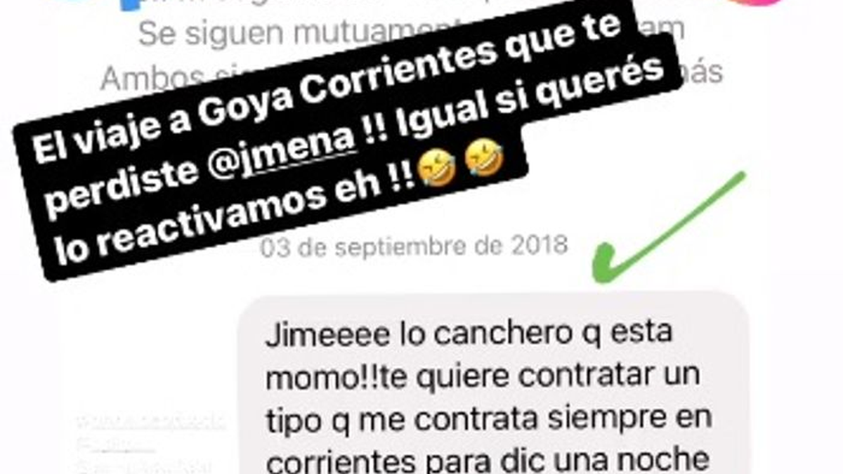 Y recién hace unas horas Jimena por fin le respondió el mensaje: "Seguramente se cayó la oferta de laburo de 2018". A lo que Guerci retrucó pícaro: "El viaje a Goya Corrientes que te perdiste. Igual si querés lo reactivamos eh".
