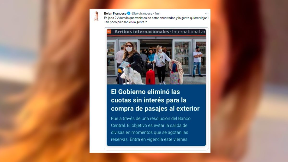 Belén Francese expresó su indignación en las redes tras una medida anunciada por el Gobierno. La ex vedette opinó de la resolución del Banco Central de la República Argentina que prohibió la compra de pasajes en cuotas para vuelos, paquetes turísticos y alojamientos en el exterior.