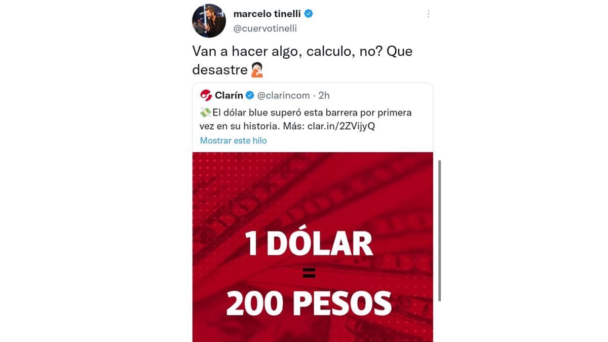 Marcelo Tinelli se hizo eco de la cotización que alcanzó el dólar blue (200 pesos por cada divisa norteamericana) e hizo una importante bajada de línea desde Twitter para el gobierno que encabeza Alberto Fernández, con quien siempre tuvo una gran relación pero que se fue quebrando en los últimos meses.