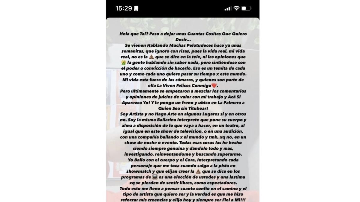 La bailarina Soledad Bayona, que integra dupla en La Academia con Mario Guerci, compartió un fuerte descargo en las redes sociales ante los comentarios que surgieron hace unas semanas de una posible relación sentimental con su compañero de pista, tema que ella misma ya desmintió al aire.