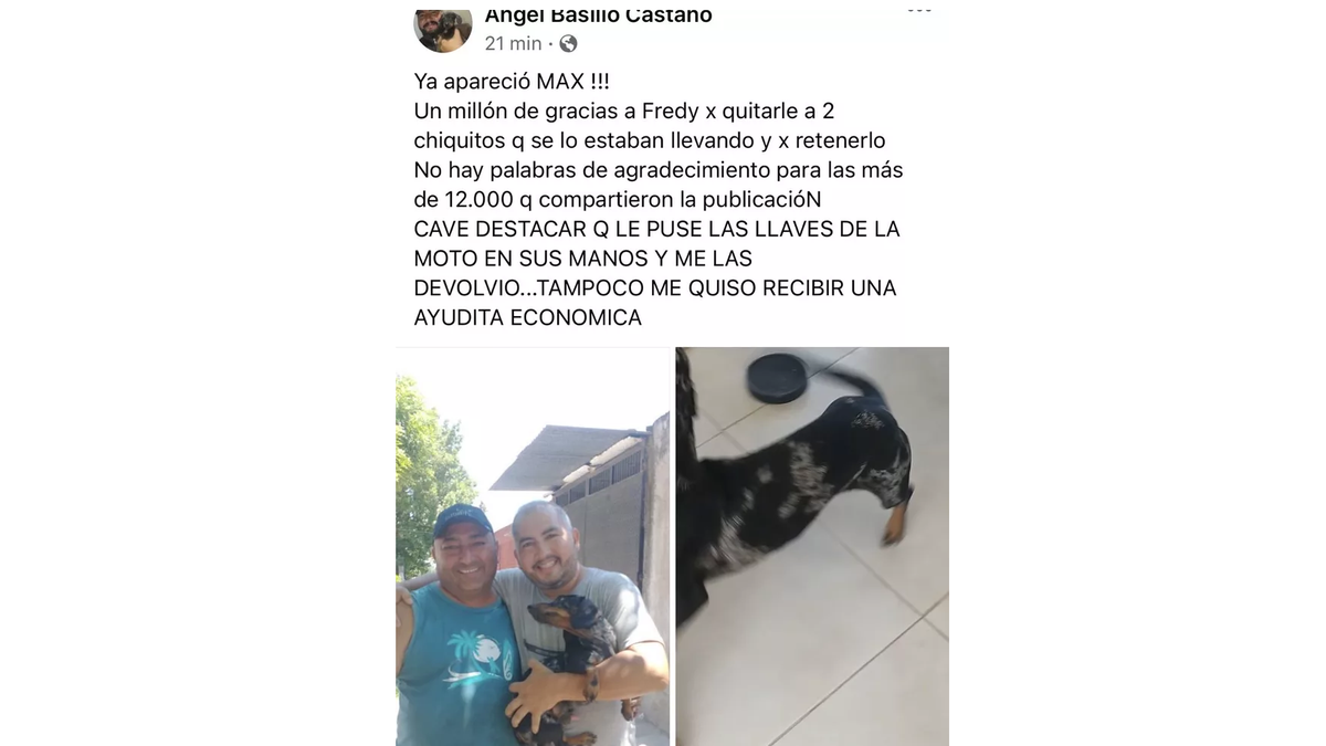 Una búsqueda de un perro perdido en Tucumán se hizo viral. La persona, identificada como Ángel Castaño, estaba buscando a Max, su mejor amigo, y de la desesperación decidió ofrecer hasta su moto como recompensa. La conmovedora historia se volvió viral, y spoiler: tuvo final feliz.