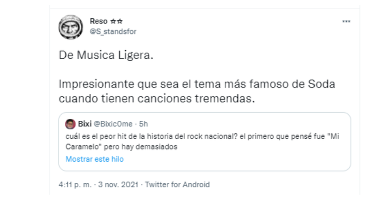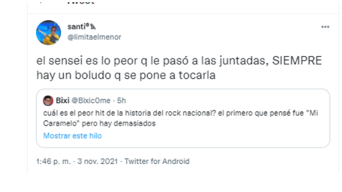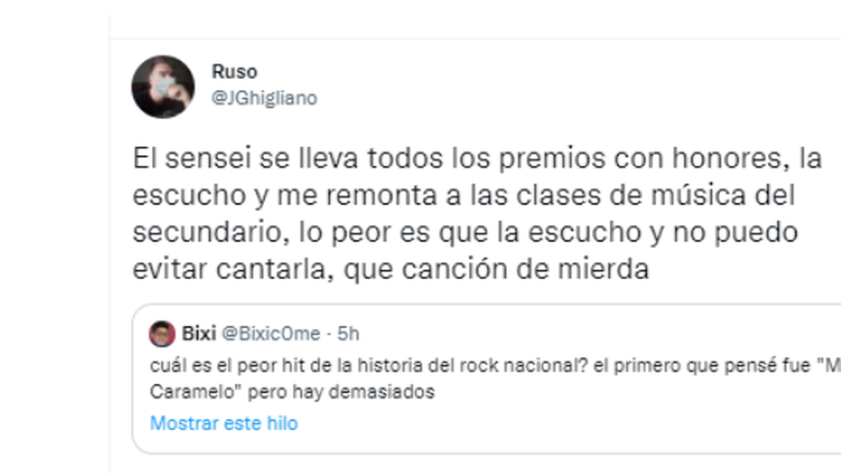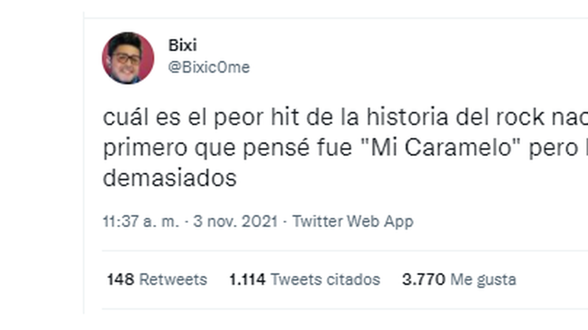 antre los temas más tabúes de Argentina se encuentra no hablar mal del rock nacional. Generalmente nadie se anima a criticar semejante época dorada musical. Sin embargo, un usuario en Twitter tuvo la valentía de proponer a sus seguidores que confiensen cuál tema creían que era el peor de la historia del rock nacional, mencionando a “Mi caramelo” como su tema elegido.