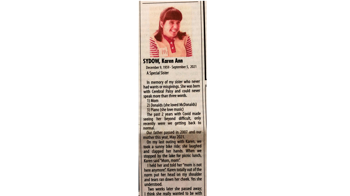 La necrología de Karen fue escrita por su hermano, Erik Sydow, y se publicó en el medio estadounidense la semana pasada. Fueron 189 palabras de puro amor. El título decía: “Una hermana especial”.