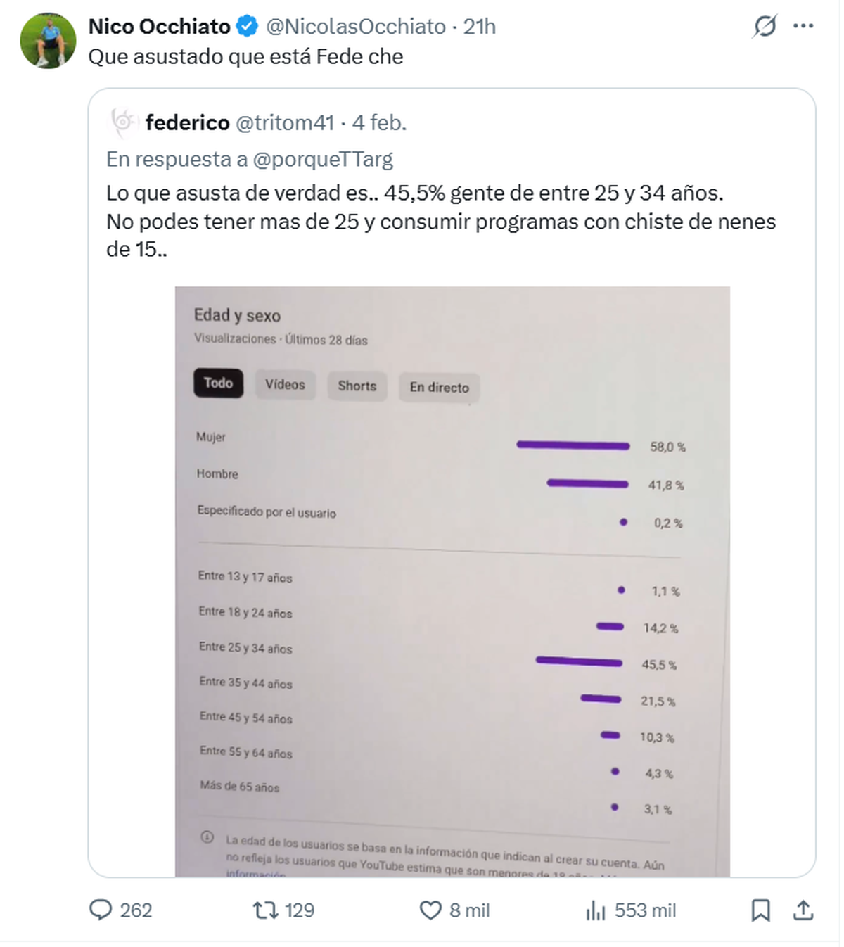 Nico Occhiato quedó en el centro de una inesperada polémica luego de compartir públicamente las métricas de su canal de YouTube. Esta semana, el fundador de Luzu TV mostró algunos datos estadísticos sobre el rendimiento de su contenido en la plataforma, pero lo que parecía ser un posteo informativo terminó convirtiéndose en el disparador de un comentario letal que lo golpeó donde más le duele: su público.