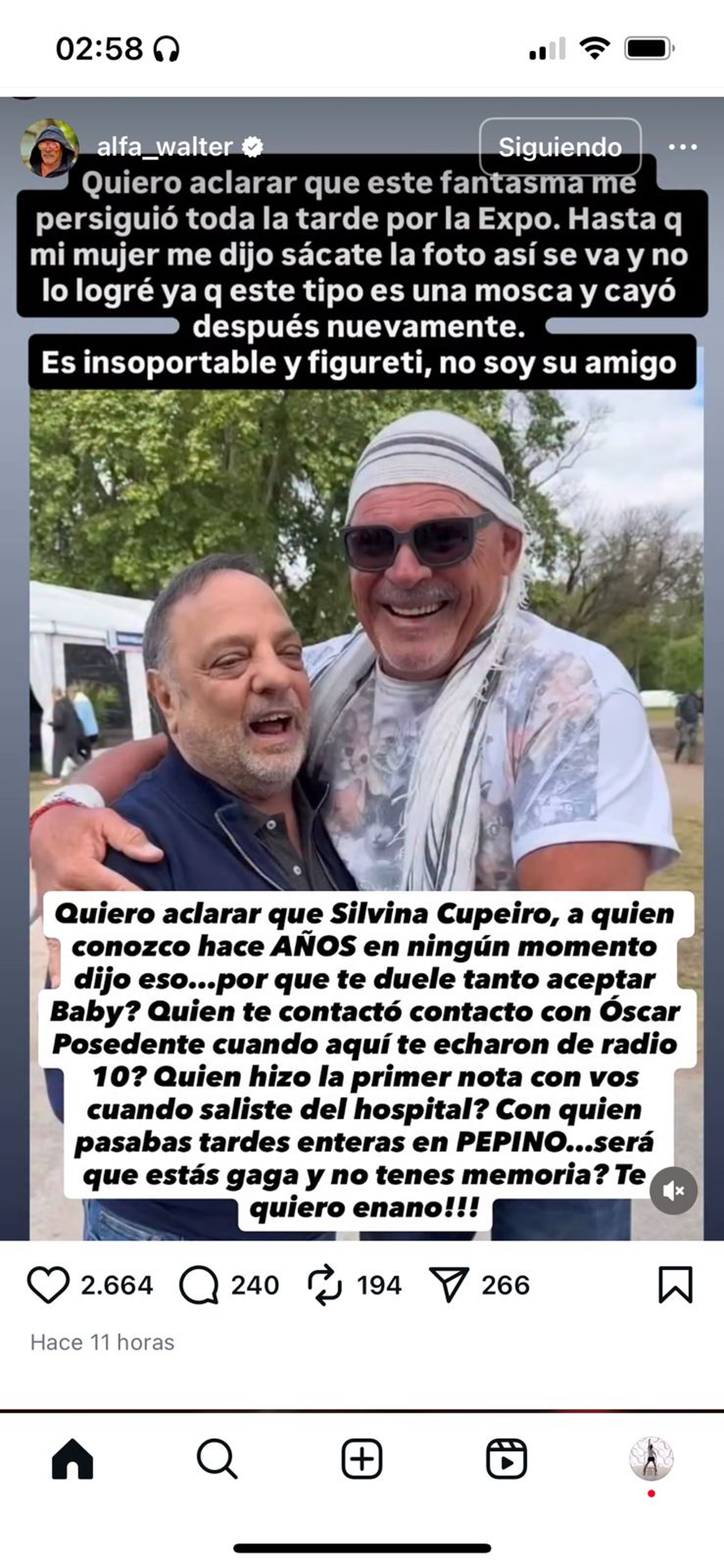 Lo que parecía un simple encuentro entre famosos en una feria de autos terminó en un verdadero escándalo mediático. Walter “Alfa” Santiago y Baby Etchecopar protagonizaron una pelea que encendió las redes y generó un vendaval de comentarios. Todo comenzó hace unos días, cuando ambos coincidieron en una exposición de automóviles. Alfa, fiel a su estilo, se acercó, charló unos minutos con el conductor radial y hasta se sacaron una foto juntos. El ex Gran Hermano grabó también un breve video, que luego publicó en sus redes sociales, sin imaginar el efecto dominó que desataría.