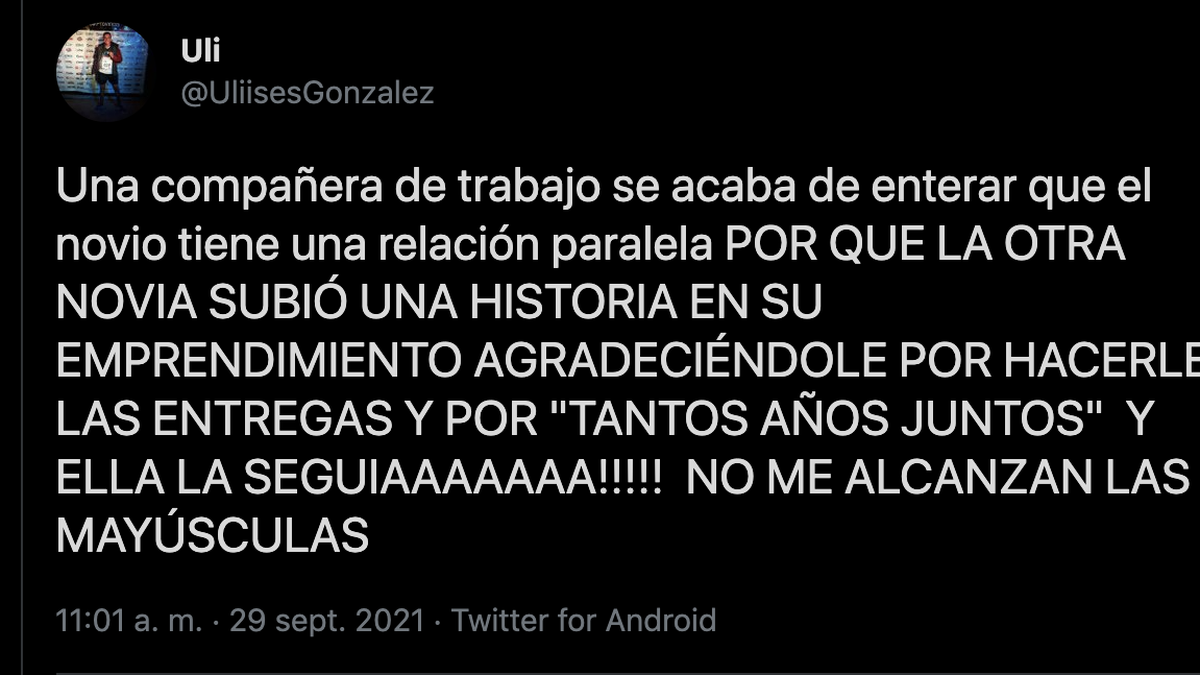 En las últimas horas se hizo viral una nueva historia de infidelidad a través de Twitter. El autor de la publicación es Uli (@UliisesGonzalez), fue víctima de una traición amorosa fue una compañera de su trabajo, que le explicó cómo fue que se enteró de la infidelidad de su pareja.