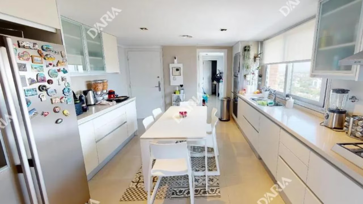 La cocina y el comedor diario, de diseño moderno y altamente funcional, se conectan con un lavadero independiente y una habitación de servicio con baño. La propiedad también cuenta con tres cocheras y dos bauleras.