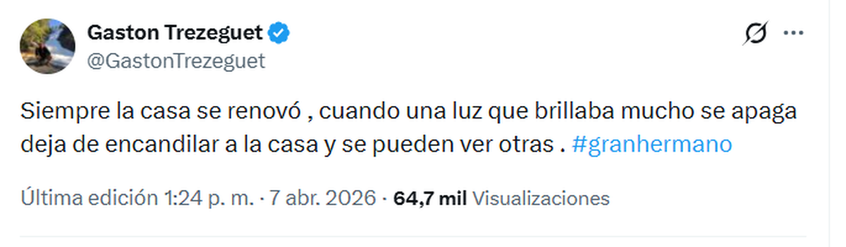 En medio del revuelo que generó la salida de Andrea del Boca de la casa de Gran Hermano, un enigmático mensaje de Gastón Trezeguet volvió a sacudir a los fanáticos del reality y abrió interrogantes sobre el futuro del juego. El histórico ex participante y actual analista del programa utilizó su cuenta de X para compartir una reflexión que muchos interpretaron como una pista sobre lo que se viene.