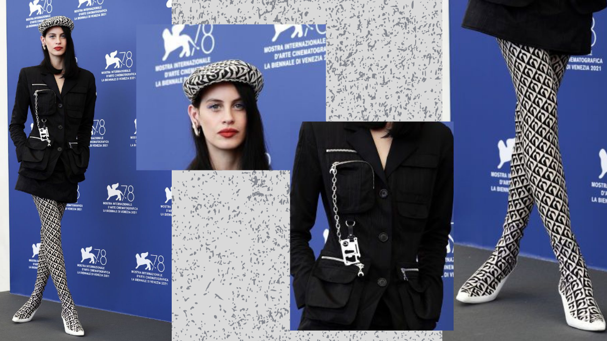 La actriz española se definió por un conjunto de la firma francesa Marine Serre. Vestido negro, corto con efecto cargo, con bolsillos. Una boina que hacen match con las mallas de estampado geométrico. Siempre con el tono negro y blanco. Botines bajos con el estampado de las mallas.