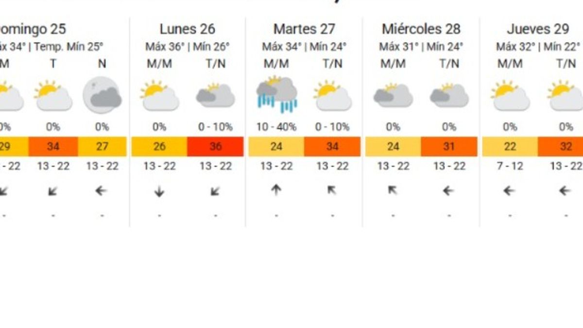 Hacia el jueves, se espera una jornada con nubosidad variable, una mínima cercana a los 22° y una máxima en torno a los 32°, sin lluvias previstas.