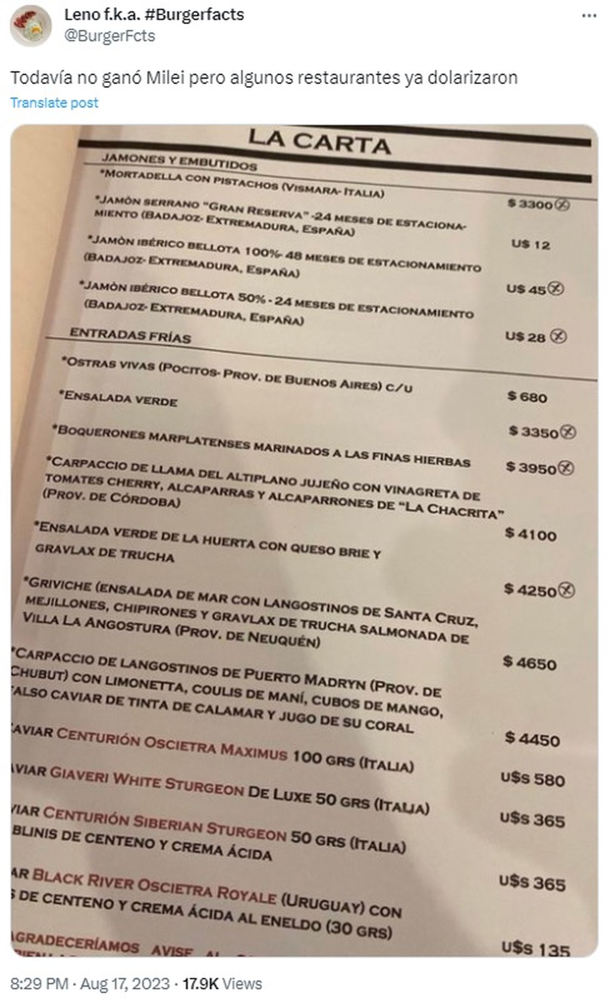 La dolarización en Argentina es una de las propuestas que Javier Milei tiene en su plataforma en caso de convertirse en presidente. Sin embargo, algunos ya tomaron la posta y decidieron que el momento es ahora, y sin miedo a las críticas un conocido restó de la zona de Recoleta convirtió la moneda de alguno de sus platos más destacados en la carta.