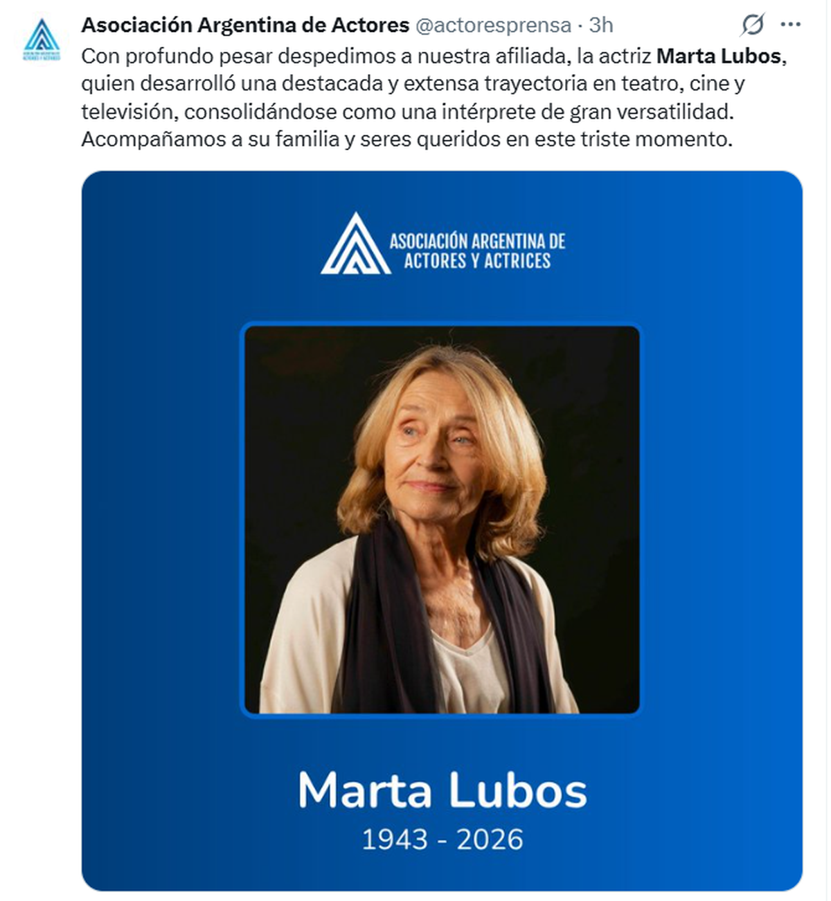 El mundo del espectáculo atraviesa horas de profundo dolor tras conocerse la muerte de Marta Lubos, una actriz de amplia y reconocida trayectoria en la Argentina. La noticia generó conmoción entre colegas, seguidores y distintas figuras del ambiente artístico, que rápidamente comenzaron a despedirla con mensajes cargados de afecto y reconocimiento.