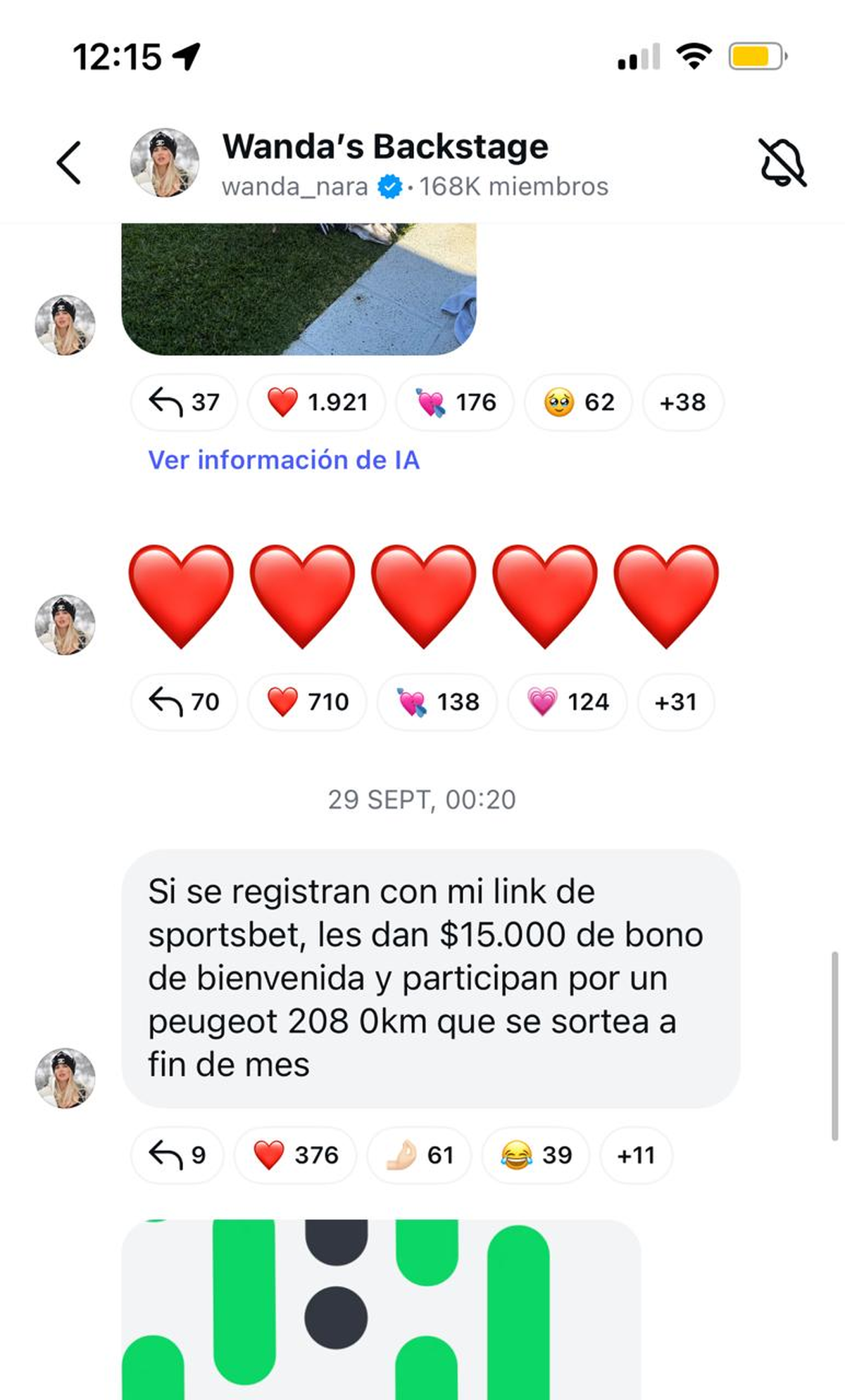 Luego, según el influencer, llega la parte más grave: “Mientras elijo, te cuento que te dejo 15k gratis y la posibilidad de ganar un auto 0 km”. Y ahí aparece la famosa “ruleta de Wanda”, un juego de premios falsos y frases delirantes: Sin suerte vale por 500.000 pesos, La próxima vale por 200.000 y suerte en el amor vale 100k; “Vos tirás la ruleta de W y te puede tocar cualquier cosa”, explicó Bongiorno, mostrando capturas.