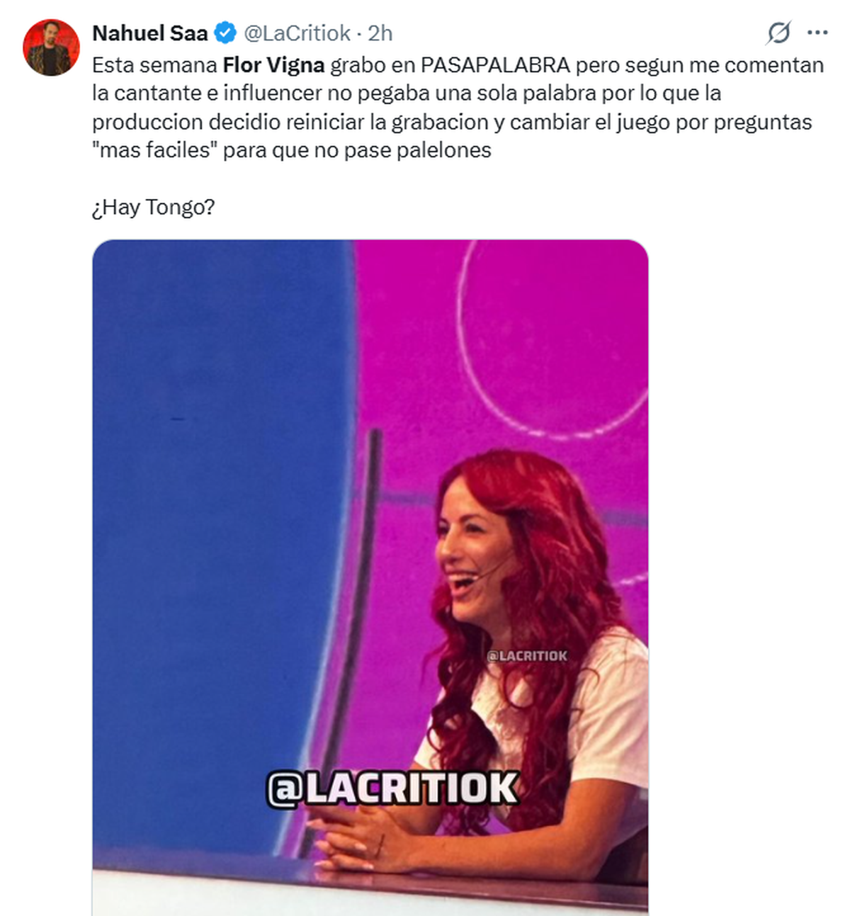 Una inesperada polémica envuelve por estas horas a Flor Vigna, luego de que se conociera una fuerte acusación vinculada a su participación en un programa de televisión. Todo salió a la luz a partir de un mensaje del periodista Nahuel Saa en X, que rápidamente generó repercusión y abrió el debate en redes sociales.