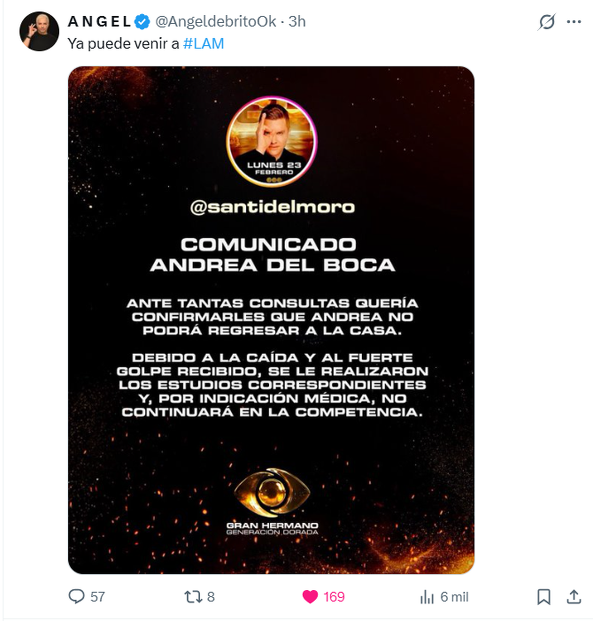 Tras confirmarse su salida definitiva de Gran Hermano, comenzó a circular una nueva incógnita en torno a Andrea del Boca: cuál será su próximo paso luego del abrupto final de su participación en el reality. La actriz no continuará en el juego luego del accidente que sufrió dentro de la casa, donde se tropezó y cayó de cara al piso, generando una situación de gran preocupación.