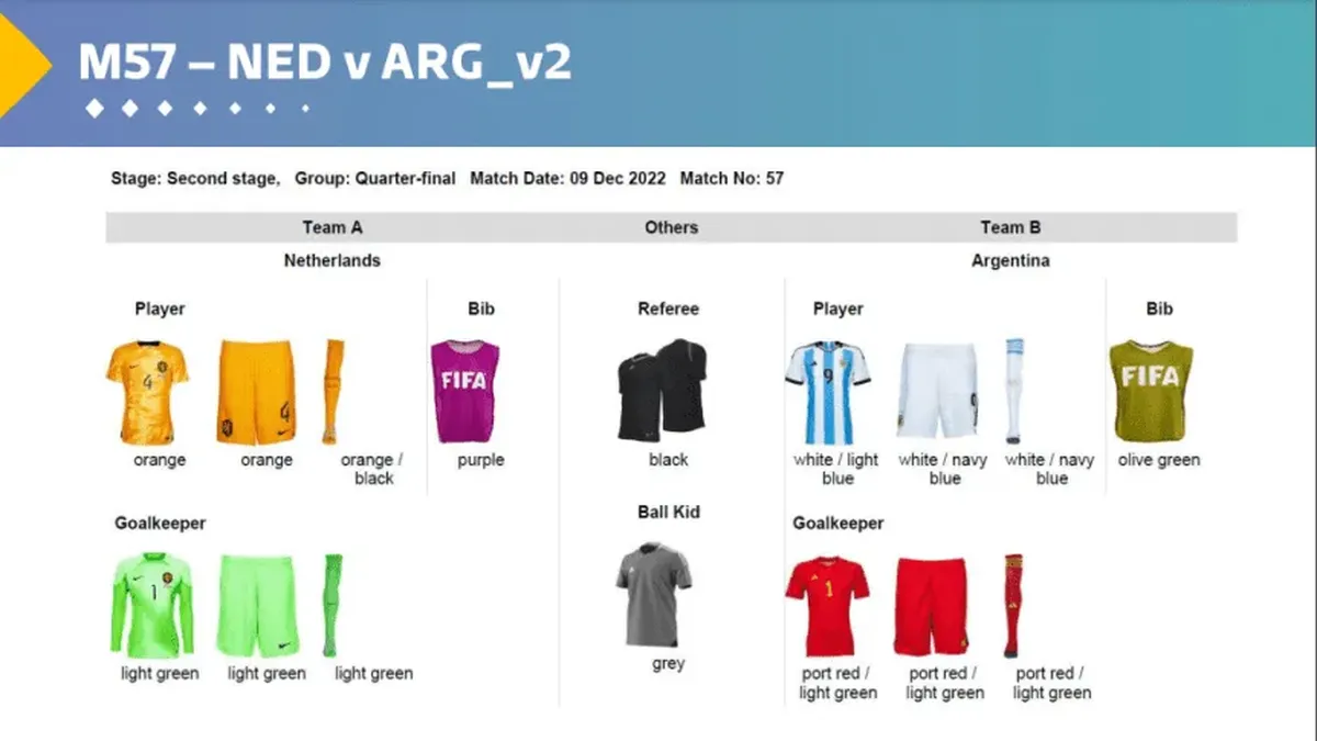 Esta combinación íntegramente blanca era algo que la Selección Argentina no usó en lo que va del Mundial. Ante Arabia Saudita, México y Australia vistió la casaca titular, pero ante los americanos utilizó medias blancas, cuando en los otros partidos lo hizo con negras y short negro. Ante Polonia, por su parte, el seleccionado albiceleste estrenó la camiseta alternativa y los jugadores se vistieron íntegramente de violeta. Por su parte, los arqueros lucirán la indumentaria roja.
