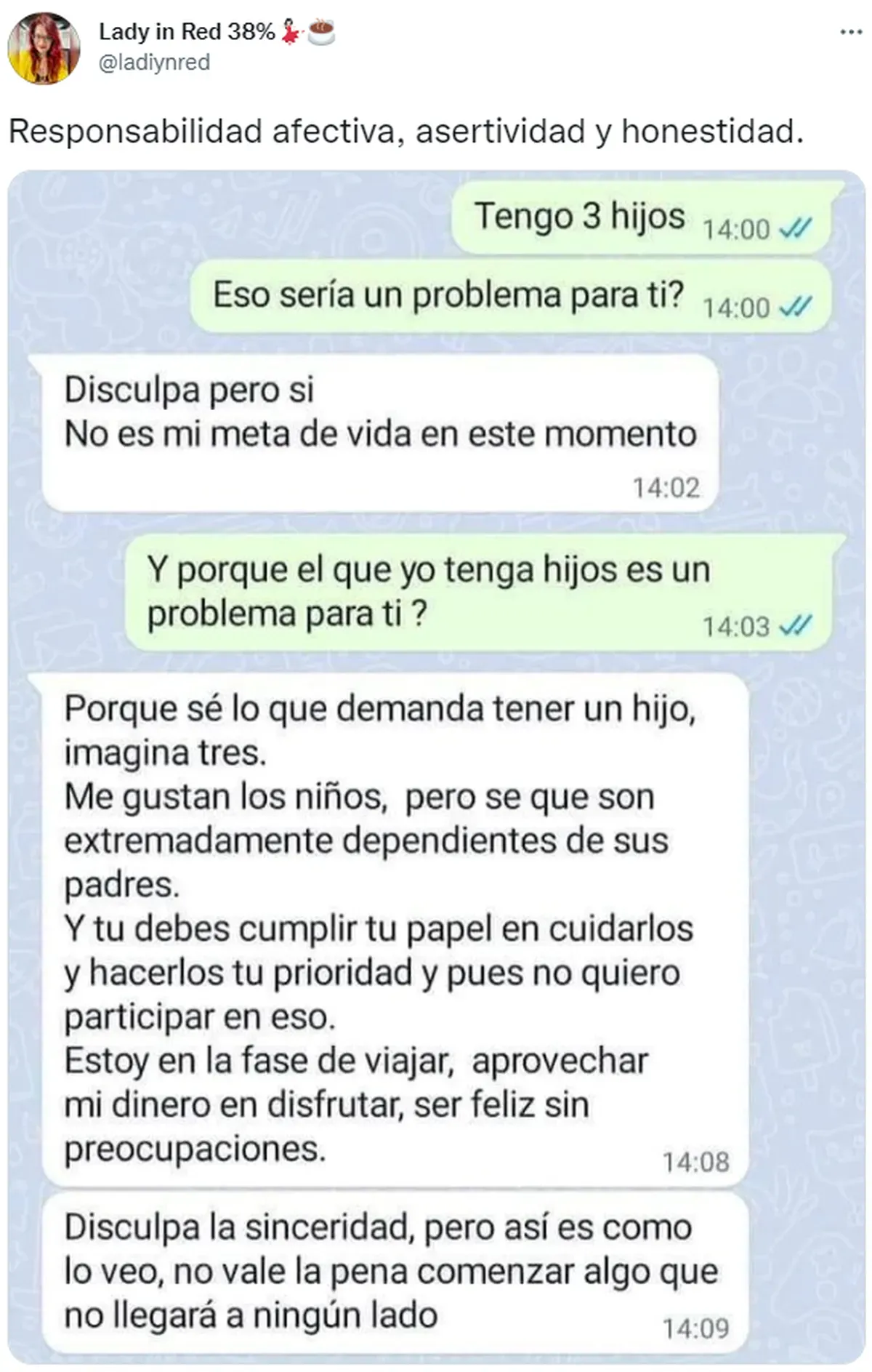 Una pareja que se estaba conociendo vía whatsapp terminó de manera abrupta por el comentario de la mujer, que contó que tenía 3 hijos. La captura fue compartida por la usuaria @ladiynred en Twitter y se volvió viral por la enorme cantidad de comentarios y opiniones sobre el tema.